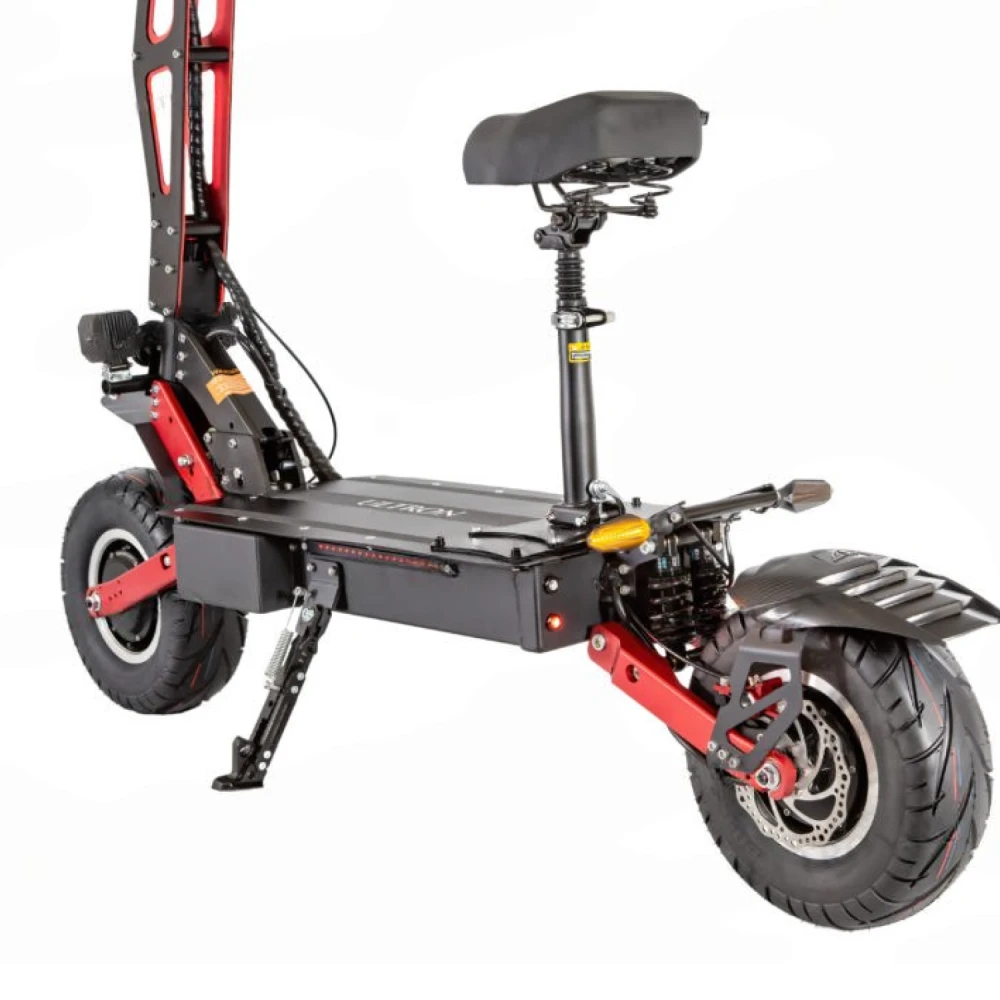 Техника оснащена полным приводом, относится к категории вездеходной. Для электросамоката не станет помехой езда по препятствиям, бездорожью, в ненастную погоду. При полном заряде АКБ транспортное средство с легкостью преодолеет 100 км пути. Чтобы езда была плавной и комфортной производитель предусмотрел гидравлические тормоза и бесшумные контроллеры.