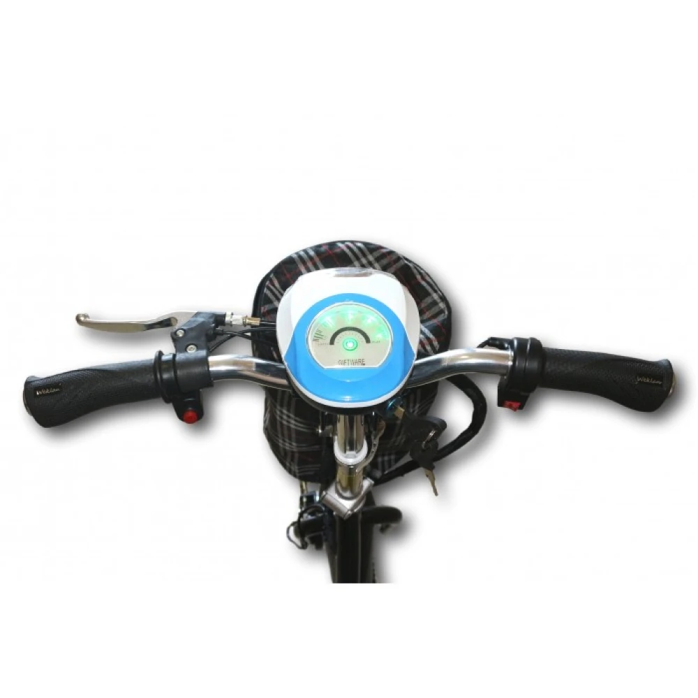 В наличие яркая фара, на рулевой стойке информационный дисплей позволяющий вести контроль за скоростью и количеством заряда батареи. Еще есть сумка, закрепленная на стойке.