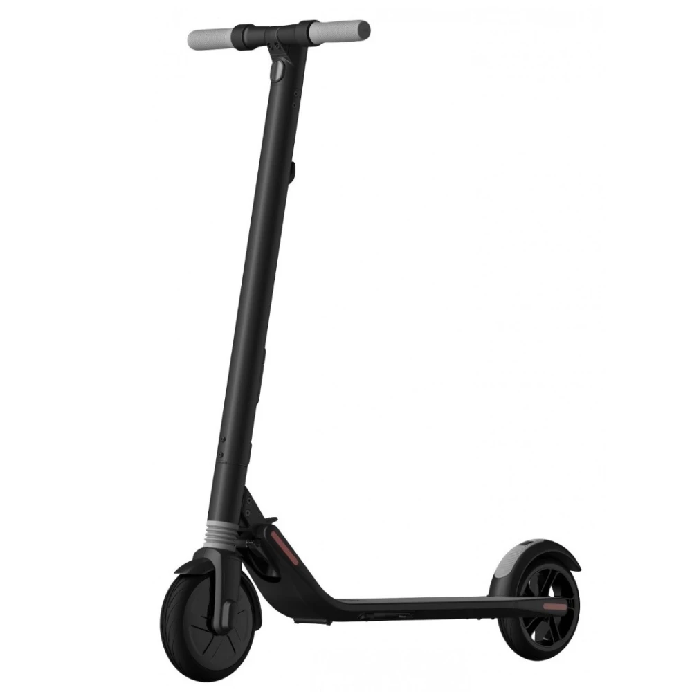 Электросамокат Ninebot by Segway KickScooter ES1 имеет удобную не скользкую платформу, колеса диаметром 8 дюймов. Электрический тормоз позволяет плавно снижать скорость, маневрировать, останавливаться. Аккумулятор установлен и герметично закрыт в руле, на переднем колесе есть амортизатор. Можно одним щелчком сложить самокат и его габариты уменьшаться вдвое.