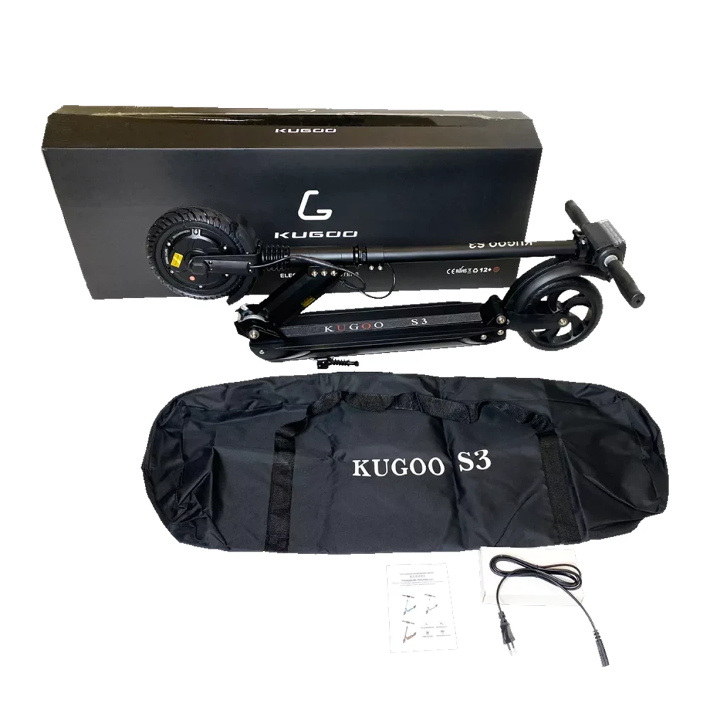 Самокат Kugoo S3 имеет запатентованную складную конструкцию, в сложенном состоянии его легко транспортировать. Его вес 11 кг позволяет переносить агрегат в руках и брать в общественный транспорт. Есть бортовой компьютер, светодиодная фара.
