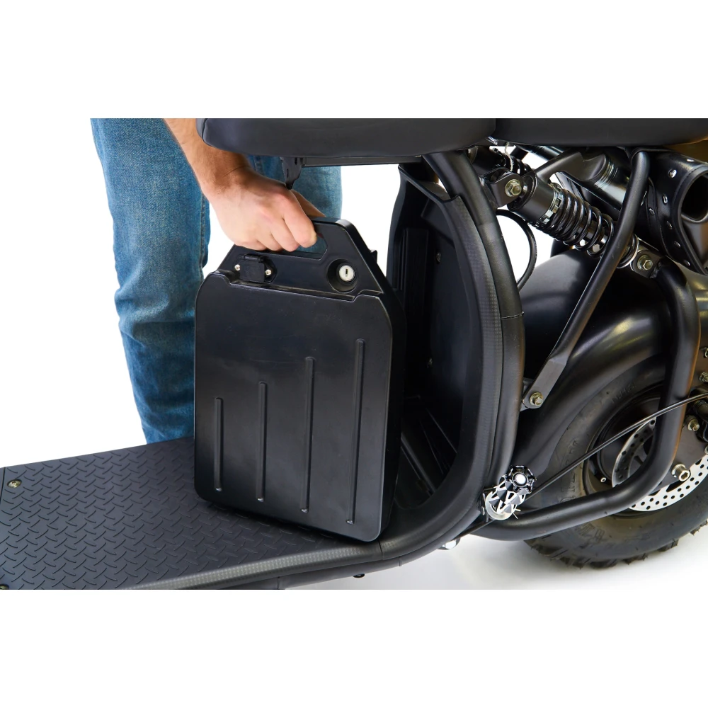 Мощность 2000 Вт электро-скутера делает его не заменимым видом транспорта, как в городе, так и вне его. Максимальная нагрузка 200 кг., второе сидение, позволяет перевозить пассажира и дополнительные грузы. Наличие аккумулятора 20Ah даёт продолжительность хода на одном заряде до 50 км. Время полной зарядки 4-5 ч. Дисковые тормоза на оба колеса и передние и задние амортизаторы делают электро-скутер комфортным видом передвижения.