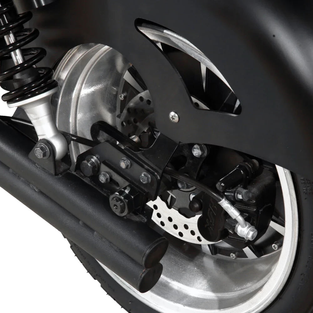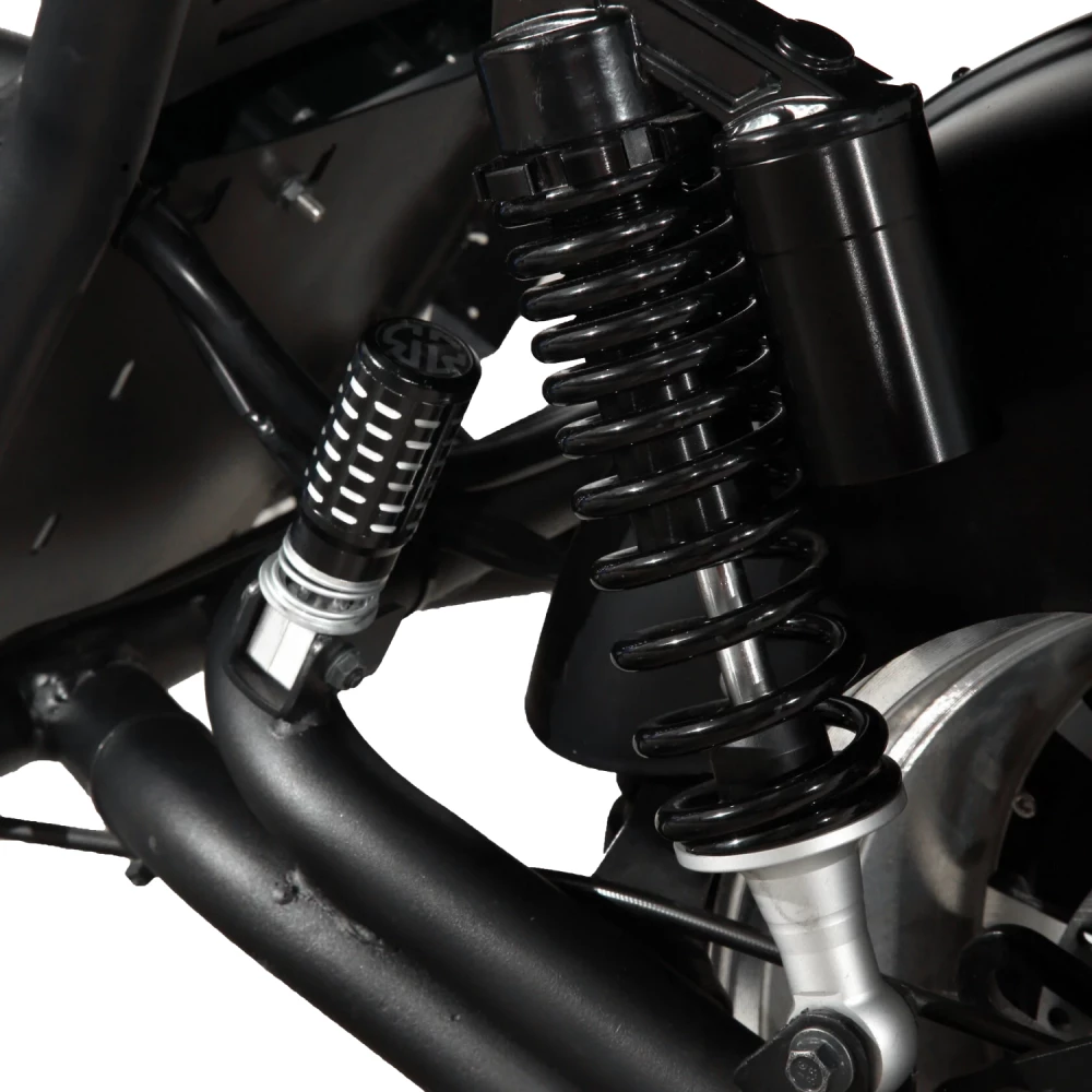 Данный электросутер оснащен широкими колесами и качественной системой амортизации.