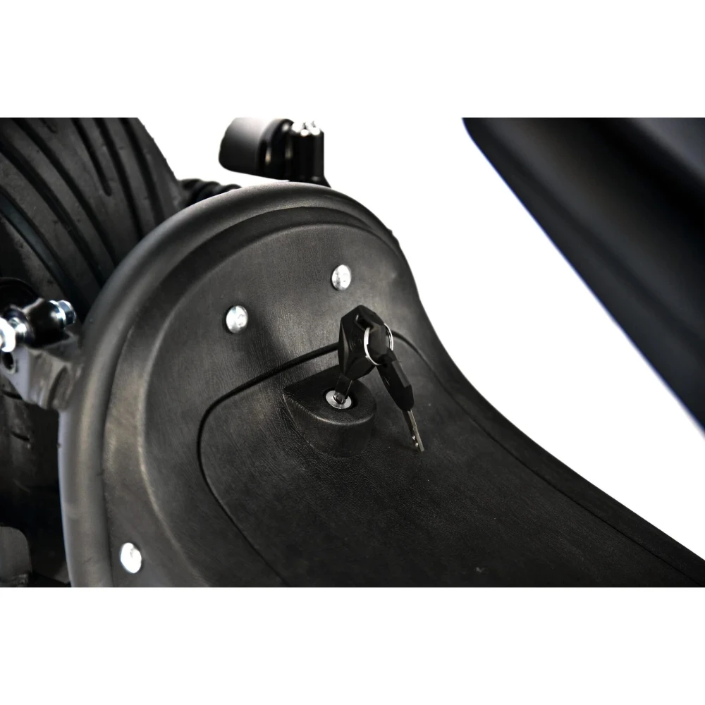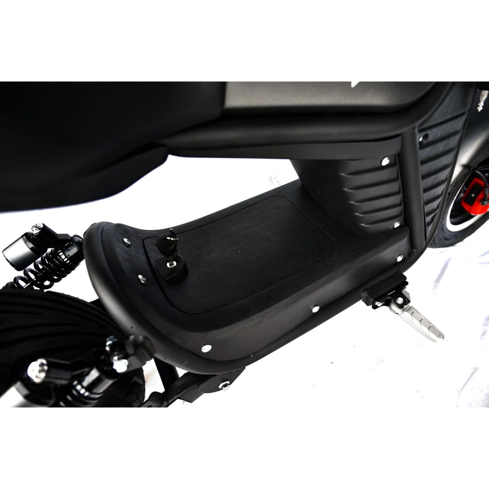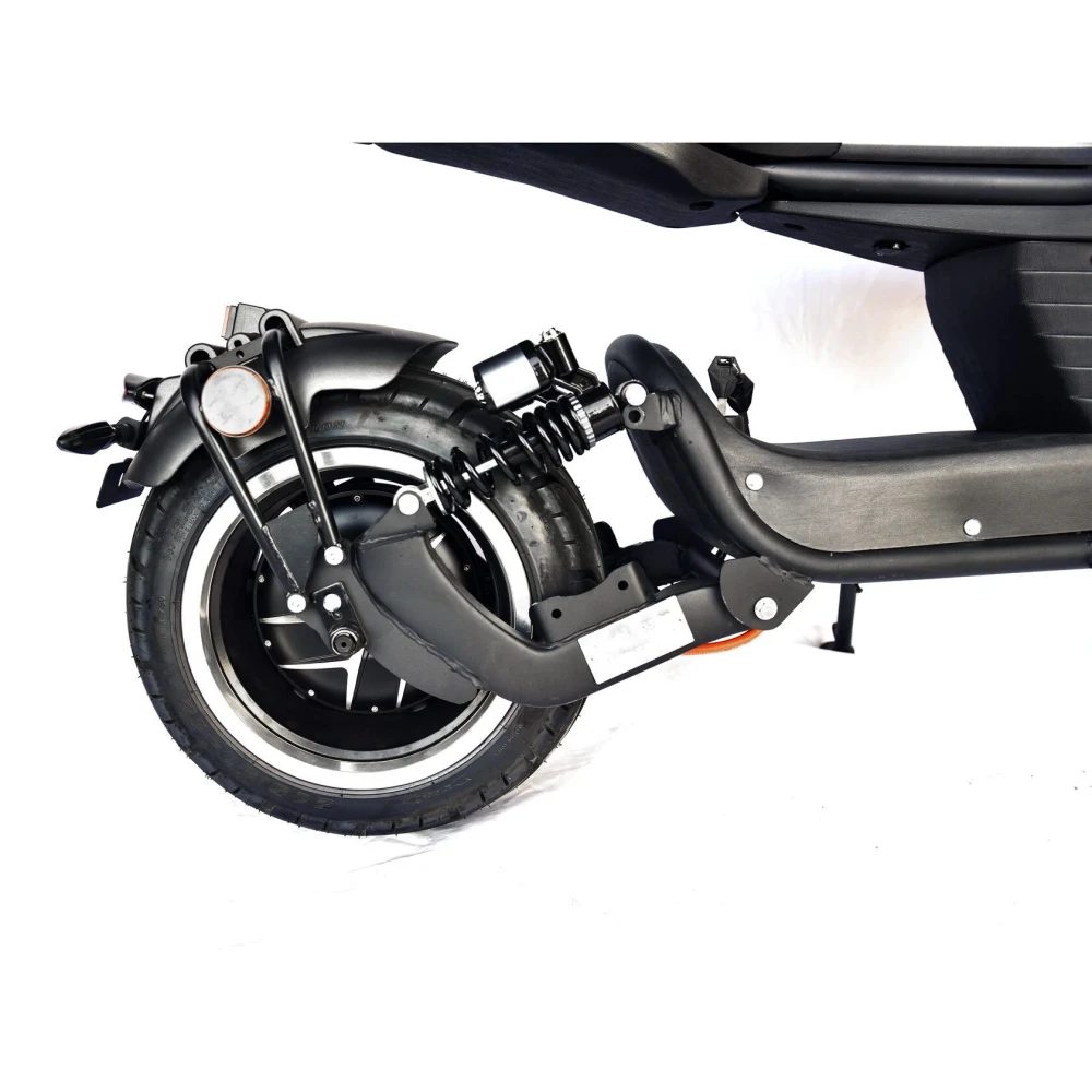 Электроскутер оснащен мощным мотор-колесом на 3950 Вт, емкой батареей на 50 А*ч, которые способны выжимать скорость автомобиля – 79 км/час, мощи которых достаточно на преодоление расстояния 110 км. Батарея заряжается быстро, для полной зарядки достаточно 5 часов. Колесная часть 13 и 12-дюймовая, бескамерная, надувная с давлением 2,7 атмосферы.