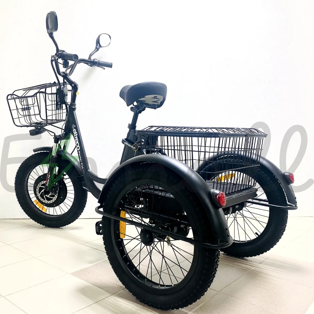 ТРИЦИКЛ ELTRECO PORTER FAT 500 UP! работает от долговечной аккумуляторной батареи. Если она разрядилась, трицикл сможет проехать еще до 40 км на резерве. Имеет стильные светодиодные фары, стальные полноразмерные крылья. Впереди на руле расположена легкая корзина, сзади – большая вместительная.