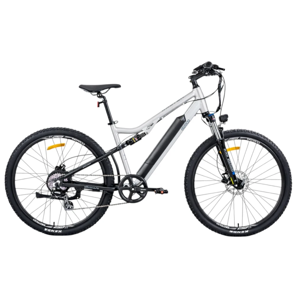 Ещё одна новинка этого года от компании Eltreco – двухподвесный электровелосипед  Walter. Новинка имеет актуальные 27,5-дюймовые колёса, которые позволяют с лёгкостью передвигаться по различным поверхностям, удобно преодолевать неровности рельефа и при этом дают велогибриду максимальную манёвренность. Прочная алюминиевая рама имеет в своей конструкции дополнительный амортизатор для усиления мягкости движения и интегрированную съёмную батарею. Также на велосипеде установлена амортизационная вилка с блокировкой хода для подбора наиболее удобного режима при поездке по разным рельефам. Велогибрид Walter имеет простую, но качественную 7-скоростную трансмиссию и практичные дисковые механические тормоза.