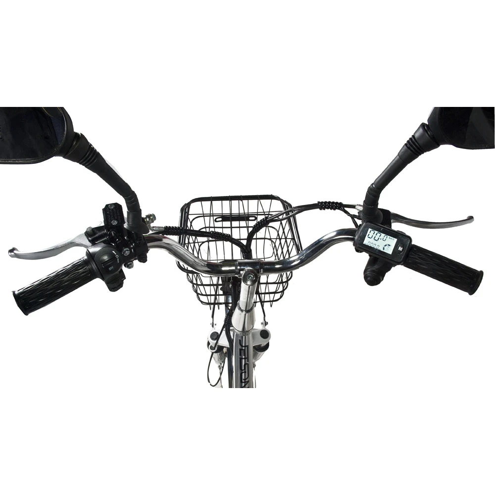 Модель оснащена надежным двигателем мощностью 500 Вт, позволяющим развивать скорость 50 км/час. Техника выполнена в лаконичном дизайне, имеет вместительную корзинку на руле для удобства поездок. Масса транспортного средства составляет 33 кг, выдерживает максимальную грузоподъемность 200 кг. Мощная батарея позволяет преодолевать расстояния на одном заряде 100 км. Фирменная тормозная система состоит из задних гидравлических и передних барабанных тормозов. Одним из значительных преимуществ электровелосипеда является наличие удобного багажника и сидения с оригинальным покрытием.
