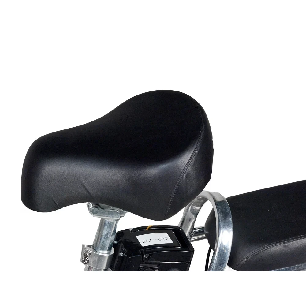 Модель оснащена 2 комфортными сиденьями. Мягкий и удобный материал изготовления повторяет анатомические части тела, снижают нагрузку с позвоночника. Основное сиденье регулируется под рост ездока. Пассажирское оснащено спинкой, допускает перевозку детей.