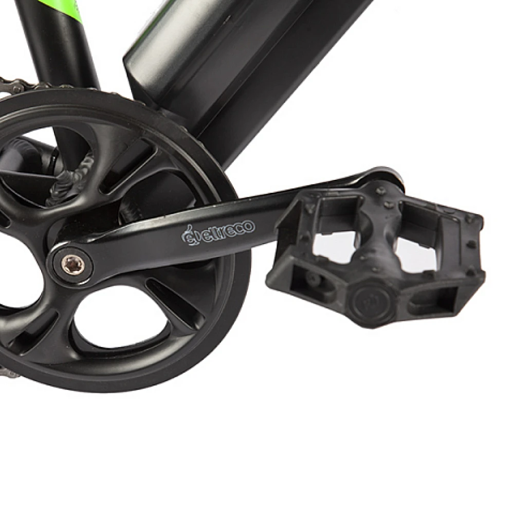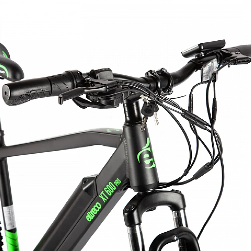 Велогибрид Eltreco XT 600 Pro в черно-зеленом цвете - это надежный и мощный спутник для всех любителей активного отдыха и комфортной езды.