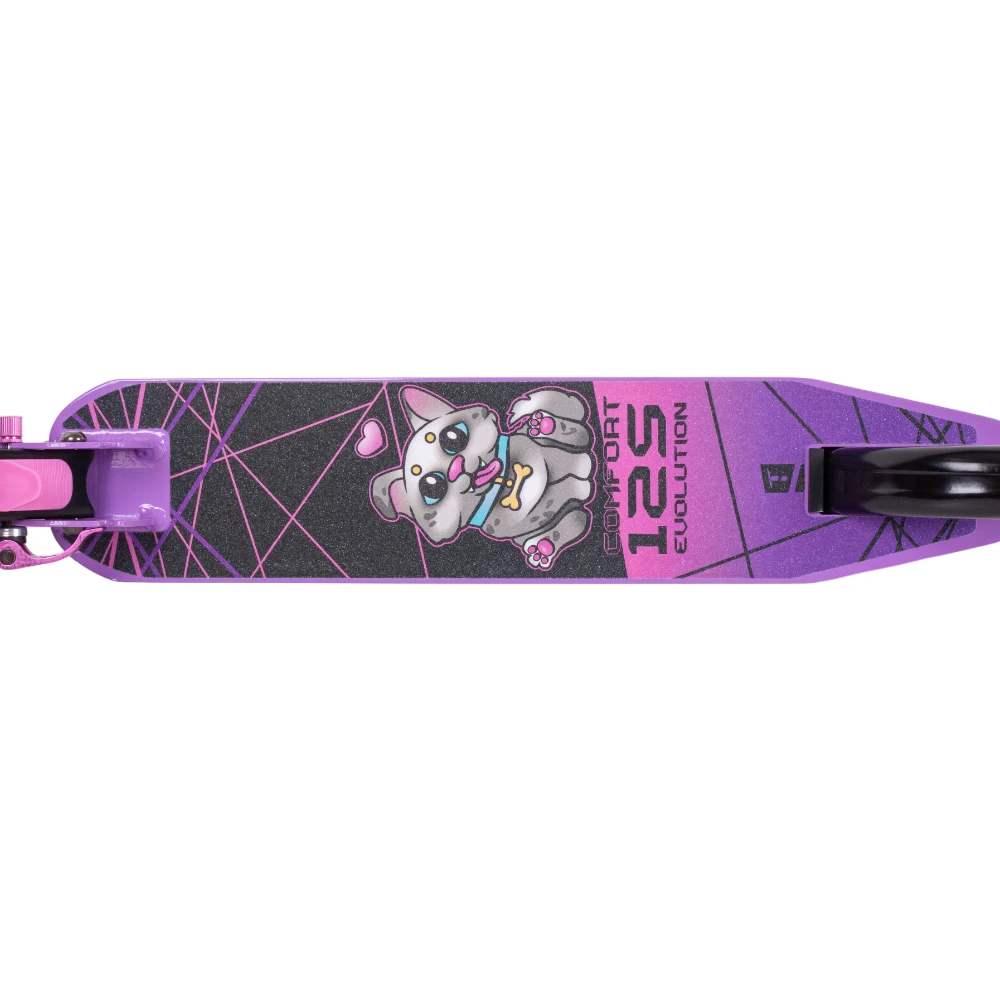 Подшипники ABEC 7 обеспечивают плавное и тихое катание, а на алюминиевой деке изображён милый песик, который наверняка понравится вашему ребёнку. Самокат Tech Team Comfort 125 Evolution 2024 - превосходный выбор для активного отдыха и весёлых городских приключений!