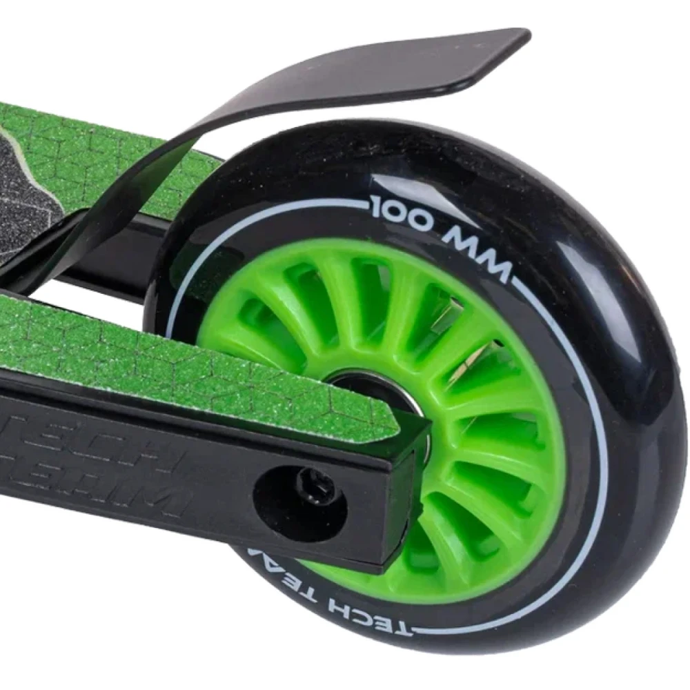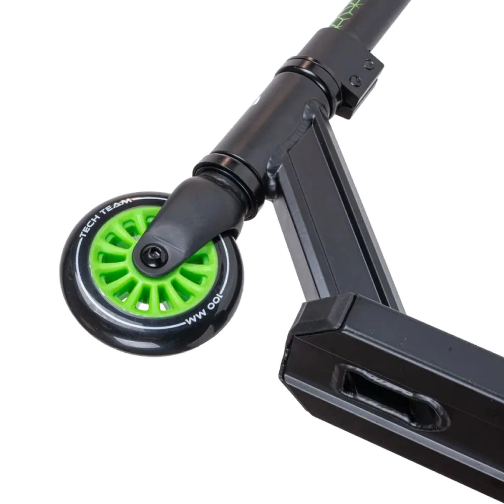 100 мм колеса обещают отличный накат и устойчивость при выполнении трюков и опасных маневров.  IHC-компрессия исключает появление люфта, посторонних шумов и других проблем. Материал изготовления колес – долговечный полиуретан. Легкая конструкция удобная и надежная для выполнения трюков.